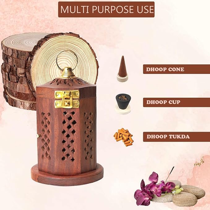 Description:-Enhance your home rituals with our handcrafted Wooden Loban Dani. Made from premium-quality wood, this elegant piece is perfect for burning loban, camphor, or incense. Its timeless design ensures safe and effective diffusion, adding warmth and positivity to any space. Ideal for pooja, meditation, or aromatherapy sessions.Handmade Dhoop Burner With Brass Handle.Traditional Design : Handcrafted Sambrani Dhoop Holder stands for pooja. Elegance: Experience the beauty of Sogra's meticulously handcrafted wooden sambrani dhoop incense holder pooja stand, designed to add a touch of tradition to your rituals. The Dhoop batti stand is suitable for both indoor and outdoor use; you can put it in the home, office , garden, religious temple, Buddhist shrine, and more.